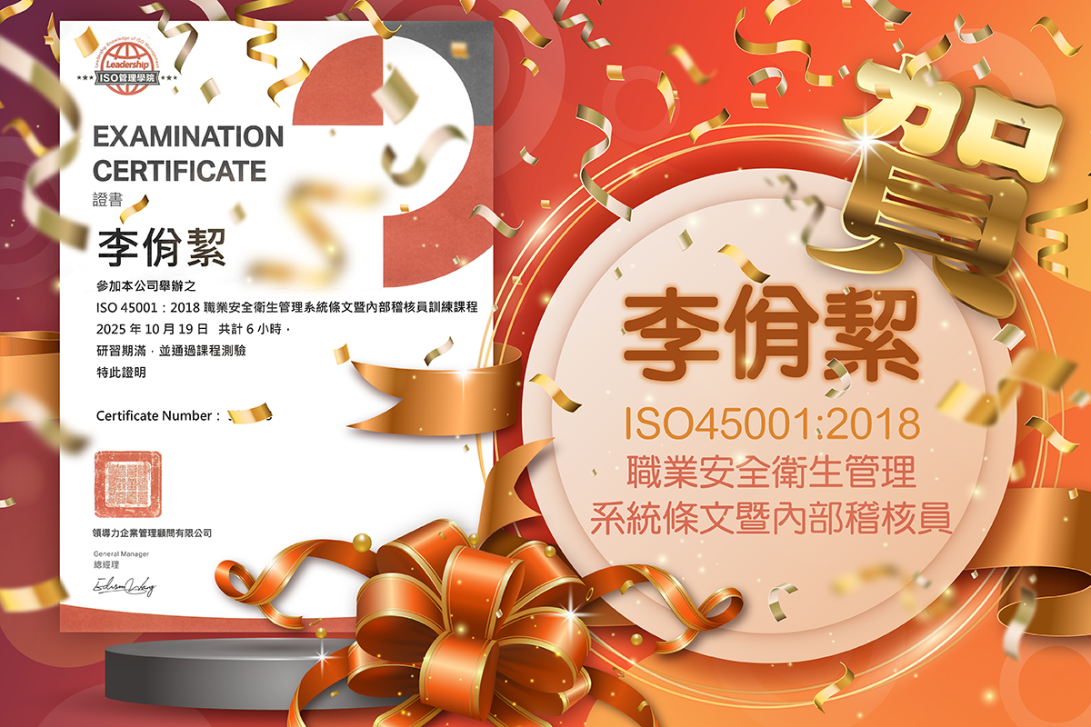 「此證照屬國際級職安管理標準的核心資格,具備此能力可協助企業建立、維運並持續改善職業安全衛生管理系統,同時依據標準規範執行內部稽核,確保各項作業流程符合法規要求與風險控管原則,ISO 45001著重於危害辨識、風險評估、作業控制及組織安全文化,而內部稽核員更是確保制度有效落實的重要角色!